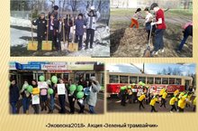 В «Зеленом трамвае» участвовали воспитанники объединения "Эко - театр Лукоморье" разных возрастных групп и наши педагоги. Ребята организовали флэш-моб на трамвайных остановках, чтобы привлечь внимание населения, раздавали шары и семена, агитационные листовки и плакаты, призывая участвовать в природоохранных акциях «Отходы в доходы», «Белая береза», «Живи, родник!», «Поможем реке», «Марш парков».