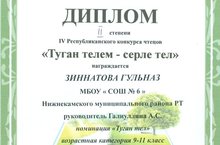 Мәктәбебез укучылары “Туган телем – серле тел” дип исемләнгән республикакүләм шигырь укучылар бәйгесендә теләп катнашалар. Бу уку елында әлеге конкурста Зиннатова Гөлназ( җитәкчесе Галиуллина А.С.)-2нче, Шәмсиева Алсу (җитәкчесе Шәйдуллина Т.Р.) 3нче дәрәҗәдәге дипломга лаек булдылар.Яговкина Вилена ( җитәкчесе Хуҗина Г.Р.), Шарафутдинова Реана(Җитәкчесе Сәхәбиева Ә.Р.) катнашучы таныклыгы алдылыр.