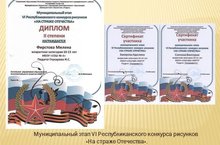 В целях реализации положений Стратегии развития воспитания обучающихся в Республике Татарстан на 2015-2025 годы, в соответствии с планом работы МО и Н РТ, управления образования Исполнительного комитета Нижнекамского муниципального района на 2016-2017 учебный год, с целью формирования у детей и подростков патриотических чувств к своей Родине, сохранение и развитие чувства гордости за свою страну на базе ЦДТ «Радуга» и ДШИ с 06 февраля по 28 февраля 2017 года прошел муниципальный этап VI Республиканского конкурса рисунков «На страже Отечества». На муниципальный этап конкурса поступило 150 конкурсных работ из 44 образовательных организаций. По итогам конкурса (приказ УО № 117 от 07.03.2017) дипломом II степени награждена Фирстова Милена за работу «Мы всегда на страже Отечества», МБОУ «СОШ № 6», педагог Глухарева И.С.