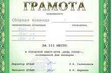 От нашей школы в мероприятии принял активное участие Самойлов Кирилл, в составе сборной команды школ № 5,6,7, обучающиеся заняли III место в городской –игре квест «Будь готов!».