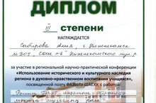 Поздравляем Сабирову Алию, обучающуюся 8 «А» класса - дипломанта III степени Региональной научно – практической конференции “Использование исторического культурног наследия региона в духовно – нравственном воспитании учащихся”, посвященный поэту Фазылу Шаеху. Сабирова Алия представила на конференцию свою исследовательскую работу на тему “Рәшит Гәрәй иҗатын өйрәнүдә мәктәп музееның роле”. Учитель Сабирова Р.Д.
