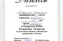 Поздравляем ЯАсадуллина Рафаэля, занявшего перове место в разделе "Кунитэ" (в возрастной категории 1 5лет) среди мальчиков в Открытом Кубке Республики Татарстан по восточному боевому единоборству дисциплина секотан.