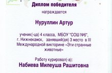 Поздравляем Нуруллина Артура, занявшего III место в Международной викторине "Эти странные животные" (педагог Набиева М.Р.)