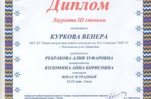 Куркова Венера - дипломант третьей степени Конкурса - фестиваля проекта "Когда мы вместе" 22.11.2015