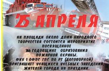 25 апреля на площадке около Дома народного творчества состоиться мероприятие, посвященное 366 годовщине образования пожарной охраны. ФКУ 1 ОФПС ГПС по РТ приглашает учащихся и их родителей на праздник. В программе праздника в 9.00 показ и демонстрация специализированных пожарных машин, в 10.00 в Доме народного творчества состоится праздничный концерт творческого коллектива отряда.