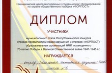 Поздравляем нашу команду и руководителя Сираева И.Р. с четвертым местом в муниципальном этапе Республикаснкого конкурса отрядов профилактики правонарушений и отрядов "ФОРПОСТ" образовательных организаций НМР, посвященного 70 - летию Победы в Великой Отечественной войне 1941-1945гг.