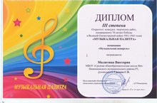 Поздравляем победителей Открытого конкурса творческих работ «Музыкальная палитра», посвященный 70 – летию Победы в ВОВ (приказ УО №137 от 30.03.15): Номинация «Музыкальная акварель» - III место Малютина Виктория (педагог Грачева С.Н.)