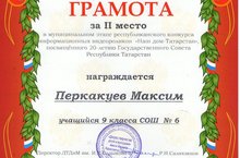 Поздравляем Перкакуева Максима, учащегося 9 "В" класса (рук. Белорусова Ю.В.), занявшего II место в Муниципальном этапе Республиканского конкурса информационных видеороликов "Наш дом -Татарстан, посвященного 20 - летию Государственного Совета Республики Татарстан.