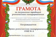 Поздравляем Школьный Совет старшеклассников и Совет командиров (руководитель Белорусова Ю.В.), победивших в номинации "За сохранение традиций ученического самоуправления" в Муниципальном этапе IВсероссийского конкурса общебразовательных организаций, развивающих ученическое самоуправление.