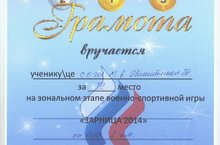 Поздравляем Никитину татьяну, учащуюся 9 Б кл., занявшую II место в зональном этапе военно -спортивной игре "Зарница" в беге на 60 метров.