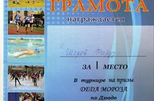 Поздравляем Шерова Фируза, занявшего первое место в турнире на призы Деда Мороза по дзюдо среди мальчиков 2001 - 2002 г. рождения.