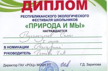 Поздравляем Мухаметзянова Самата, победителя Республиканского экологического фестиваля "Природа и мы" в номинации "Мастерилка" (педагог Ганиева Г.А.), сертификатом участника отмечет Глухарев Никита в номинации "Исследовательские проекты" (педагог Глухарева И.С.)