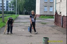 В июле месяце в школе работают трудовые отряды школьников. Учащиеся 5Б,7Б, 7В классов поливают грядки и клумбы, ухаживают за цветами, радуются ярким цветам и бутонам. Работа кипит и внутри школы: дети моют парты, приводят в порядок учебные классы.