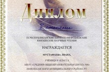 В IX Республиканских Кирилло-Мефодиевских юношеских научных чтениях приняли участие и показали хорошие результаты учащиеся нашей школы. Мустафаева Лиана, ученица 9 класса, награждена Дипломом II степени за успехи в области языкознания (учитель И.Ю.Сергеева); Рашидова Ангелина (8 кл.) награждена сертификатом участника научных чтений (учитель М.В.Хасанова). Мы желаем им и дальнейших успехов в достижении научных высот! Молодцы!