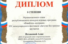 Дипломом I степени награждена ученица 10 класса Исхакова Алия за участие в муниципальном этапе республиканского конкурса игровых программ "Взвейтесь кострами" XIV международного фестиваля "Детство без границ". Поздравляем!!!