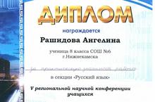 Ученица 8 класса Рашидова Ангелина награждена Дипломом КФУ (г.Набережные Челны) за практическую значимость работы в секции "Русский язык" V региональной научной конференции учащихся. Научный руководитель - учитель татарского языка и литературы Хасанова Миляуша Василовна - за подготовку участника награждена Благодарственным письмом.