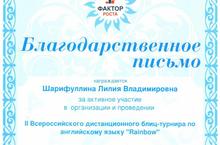 Благодарственным письмом ЦДМ Фактор Роста награждена Шарифуллина Лилия Владимировна - учитель английского языка - за активное участие в организации и проведении II Всероссийского дистанционного блиц-турнира по английскому языку "Rainbow".