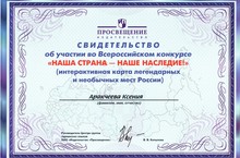 Ученица 6 класса Аракчеева Ксения и учитель английского языка Шарифуллина Л.В. награждены Свидетельством об участии во Всероссийском конкурсе "Наша страна - наше наследие!" (интерактивная карта легендарных и необычных мест России).