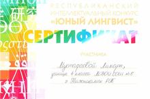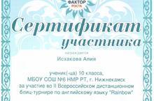 Ученица 10 класса нашей школы Исхакова Алия награждена Сертификатом участника во II Всероссийском дистанционном блиц-турнире по английскому языку "Rainbow".