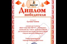Дипломом победителя награждена ученица 4 класса нашей школы Сычева Галина, занявшая 1 место во Всероссийской дистанционной викторине "Математические ловушки весёлого Карандаша". Мы поздравляем Галину и желаем ей дальнейших успехов в учёбе.