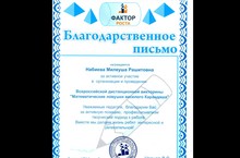Наш замечательный педагог Набиева Милеуша Рашитовна награждена Благодарственным письмом за активное участие в организации и проведении Всероссийской дистанционной викторины "Математические ловушки весёлого Карандаша". Директор ЦДМ "Фактор роста" Д.С.Чернов поблагодарил педагога за активную позицию, профессионализм и творческий подход к работе.