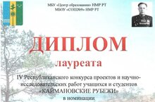 Наши обучающиеся приняли активное участие в IV Республиканском конкурсе проектов и научно-исследовательских работ учащихся и студентов "Каймановские рубежи" и показали отличные результаты. В номинации "Галерея военной славы" дипломами лауреатов награждены Шарипова Самина (3А), Хамзина Эмилия (6А), дипломом III степени - Насибуллина Самира (6А), I степени - Зверева София (6Б) и Ильина Виктория (7А). В номинации "Проба пера" Каримова Азиля (8Б) заняла I место, Бариева Самира (9А) - III место. Поздравляем ребят и их руководителей: Ильязову Гульназ Наилевну, Зиганшину Венеру Гависовну, Шайдуллину Танзилю Рахимулловну, Сабирову Ралену Даимовну, Сергееву Ирину Юрьевну. Желаем новых побед и творческих успехов!