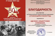 Учитель русского языка и литературы Сергеева Ирина Юрьевна и ученица 11 класса Гилязева Аделина приняли участие во Всероссийской патриотической видеоакции "Сражающийся Ленинград", посвященной 80-летию полного освобождения Ленинграда от фашистской блокады.