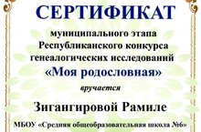 Учащиеся 5А класса Гайнутдинов Самир, Зигангирова Рамиля и Хуснуллин Камиль приняли участие в муниципальном этапе Республиканского конкурса генеалогических исследований "Моя родословная" (учитель Сабирова Ралена Даимовна).