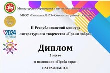 Ученица 11А класса Цынцарь Виктория награждена дипломом за II место во II Республиканском конкурсе литературного творчества "Грани добра" в номинации "Проба пера" (учитель Сергеева Ирина Юрьевна).