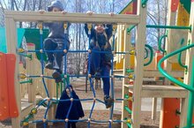 В группе продлённого дня ученики начальной школы гуляют на детской площадке парка "Юность", радуясь первому весеннему теплу и солнцу.