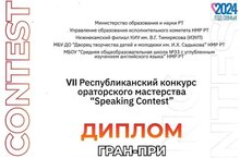 Поздравляем учителя русского языка и литературы Сергееву Ирину Юрьевну, награждённую дипломом Гран-при VII Республиканского конкурса ораторского мастерства "Speaking Contest". Дипломом III степени этого конкурса награждена ученица 5А класса Сысина Оксана (учитель Гимадеева Ляля Мунировна).