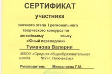 В феврале прошел заочный этап I регионального творческого конкурса по английскому языку «Юный переводчик», где ученица 9 б класс Туманова Валерия и ученица 10 а класса Захарова Карина получили сертификаты. Руководитель Мингалиева Г.М.