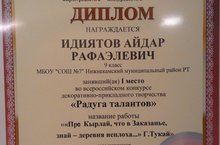 Идиятов Айдар ученик 9 а класса стал победителем Всероссийского конкурса декоративно- прикладного творчества возрастной категории 9- 11 класса.