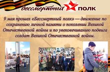Учащиеся 8 а класса ежегодно принимают участие в движении "Бессмертный полк" по сохранению личной памяти о ветеранах войны и по увековечиванию подвига солдату Великой Отечественной войны.