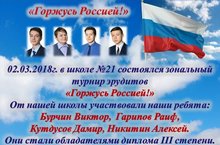 Ученики 8 а класса: Гарипов Раиф, Никитин Алеша, Кутдусов Дамир, Бурчин Виктор приняли участие в зональном турнире эрудитов "Горжусь Россией" и стали обладателями диплома III степени. Поздравляем ребят!