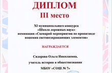 Педагог Сидорова О.Н получила диплом 3 место в муниципальном конкурсе "Школа дорожных наук" в номинации "Сценарий мероприятия по пропаганде ношения световозвращающих элементов"