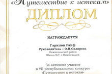 Гарипов Раиф, ученик 7а класса, был приглашен на офицальную церемонию награждения участников 7 республиканского конкурса "Путешествие к истокам", которая состоялась в г Казане, Казанская Ривьера", конгресс - холл "Эрмитаж"