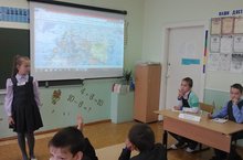 В 4в прошел урок-конференция на тему "Путешествие за границу России". Конференция началась с гимна страны. Все было по-настоящему: докладчики, оппоненты, президиум. Ребята подготовили доклады о граничащих с Россией странах. Урок прошел очень интересно.
