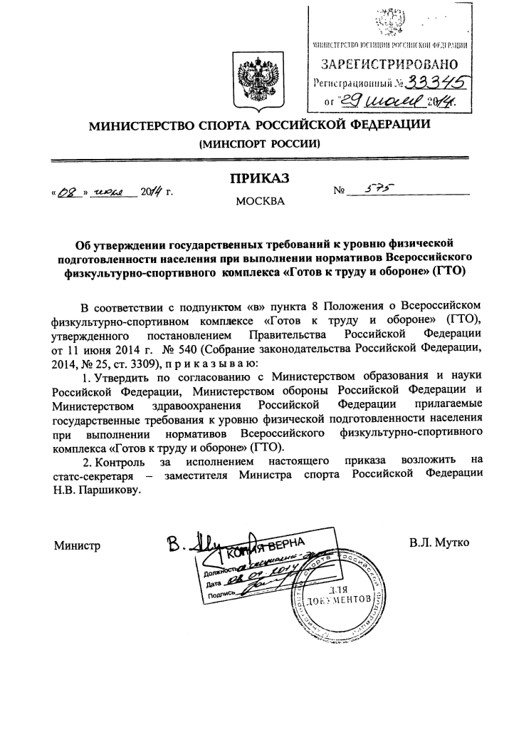 Приказ об утверждении государственных требований к уровню физической подготовленности