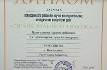 Ученица 7в класса Назмутдинова Аделина стала лауреатом Всероссийского фестиваля научно-исследовательских работ "Сердце Родиной тревожь!" (рук-ль: Джаппарова С.К.).