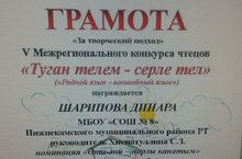 Поздравляем ученицу 1а класса Шарипову Динару с победой в Межрегиональном конкурсе чтецов "Туган телем-серле тел" (руководитель: Хисматуллина С.З.).