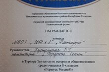 Команда "Фантазеры" получила Грамоту в турнире эрудитов по истории "Горжусь Россией!" среди 8-х классов в номинации "Гордость России" (руководитель: Хуснуллина Р.Г.).
