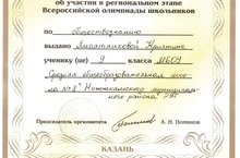 Учащиеся нашей школы активно участвуют во Всероссийских олимпиадах. Ученица 9-го класса Липатникова Кристина приняла участие в региональном этапе Всероссийской олимпиады среди школьников по обществознанию (учитель: Силаева Е.Н.), проходившем в городе Казань.