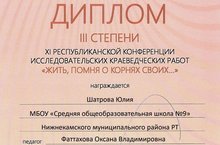 Поздравляем учащуюся 10А класса Шатрову Юлию с победой в республиканской конференции "Жить,помня о корнях своих...", диплом lll степени, педагог Фаттахова Оксана Владимировна. Поздравляем ! Гордимся ! Так держать !
