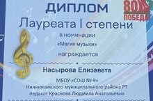 Наша ученица Насырова Елизавета ( педагог Краснова Л.А.) стала Лауреатом 1 степени в Республиканском конкурсе творческих работ посвященный 80- летию Победы в Великой Отечественной войне «Музыкальная палитра».