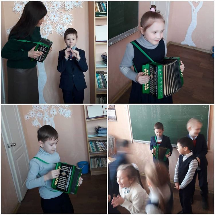 Ученики 1 а класса на уроке родного языка изучали народные инструменты.Пробовали играть на них.