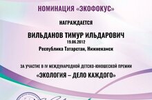 Учащийся 6А класса Вильданов Тимур принял участие в IV международной детско-юношеской премии «Экология - дело каждого» номинация «Экофокус».