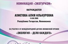 Учащаяся 9А класса Ахметова Алия приняла участие в IV международной детско-юношеской премии «Экология - дело каждого».
