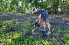 Учащиеся Школы №9 с большим вниманием и любовью ухаживают за елями посаженными нашими ветеранами.