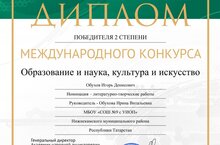12 мая учащийся 6Б класса школы №9 Обухов Игорь стал призёром Международного конкурса «Образование, наука, культура и искусство». На конкурсе было представлено стихотворение о войне «Была война....». Молодец ! Поздравляем ! Так держать !